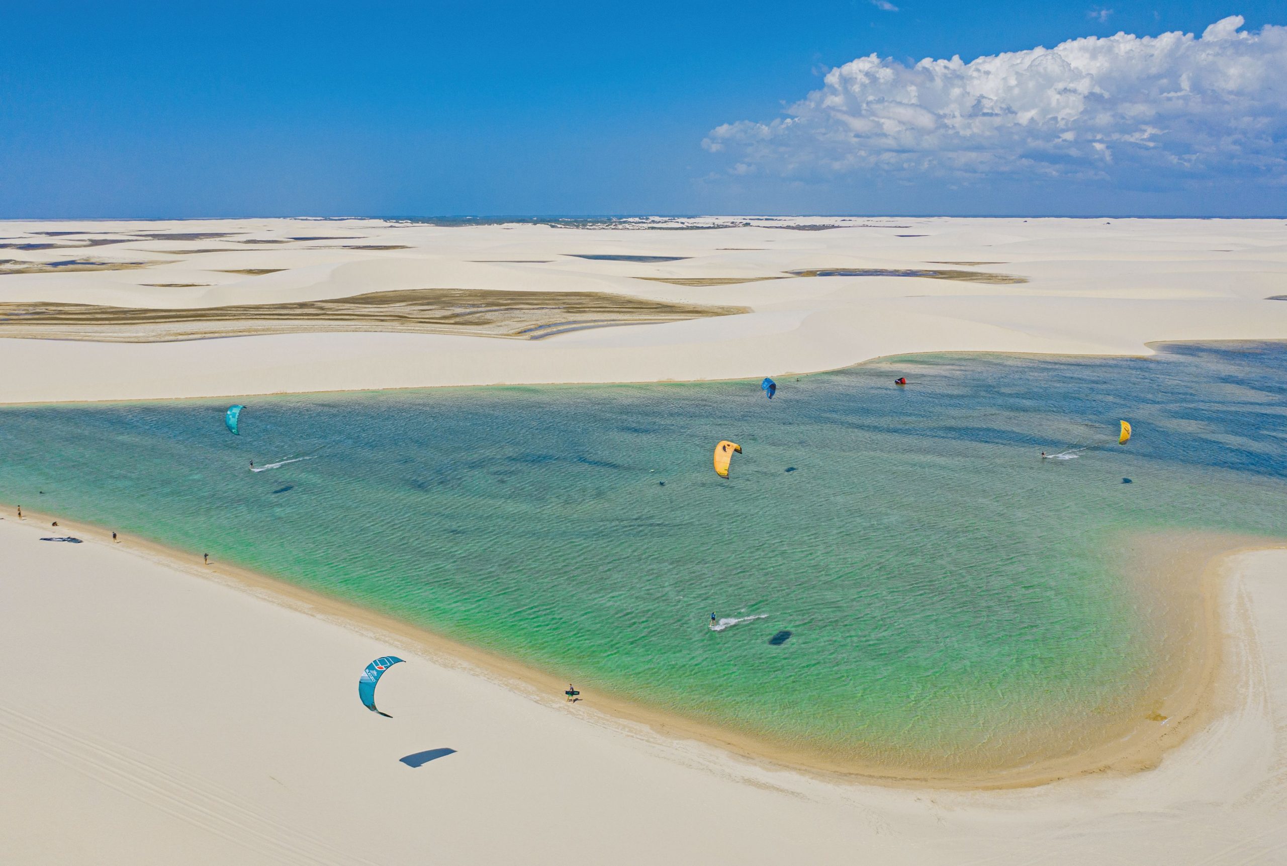 Um dos lugares mais icônicos do mundo. Velejar nas lagoas entre as dunas é uma experiência quase mística — como flutuar sobre espelhos d’água cristalinos em meio a um deserto de areia branca infinita. Mas é um destino para velejadores experientes: há sombras de vento e condições técnicas desafiadoras. A temporada ideal vai de julho a setembro, e nem todas as lagoas são liberadas para o esporte. Ainda assim, cada rajada de vento traz um silêncio raro, quase sagrado. É um cenário que parece saído de um sonho.