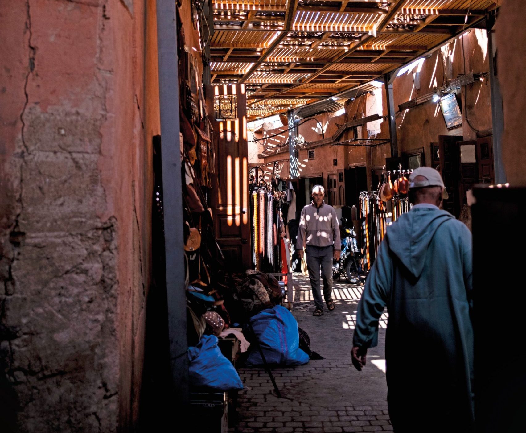 Pelo museu você tem acesso ao Bacha Coffee, fundado em 1910, que é, sem dúvida, o café mais charmoso de toda a cidade e uma experiência do melhor savoir vivre marocain. (Fique atento, fechado às segundas!). Agora mergulhe para desbravar pelas próximas horas os souks e suas infinitas ruelas. Lojas de arte, decoração, artesanato, artigos de couro, tapetes e tecidos, chás, temperos. Tudo é oferecido simultaneamente, loja após loja, apesar de haver certa divisão por áreas: uma mais especializada em roupas, outra em potes e louças etc.
