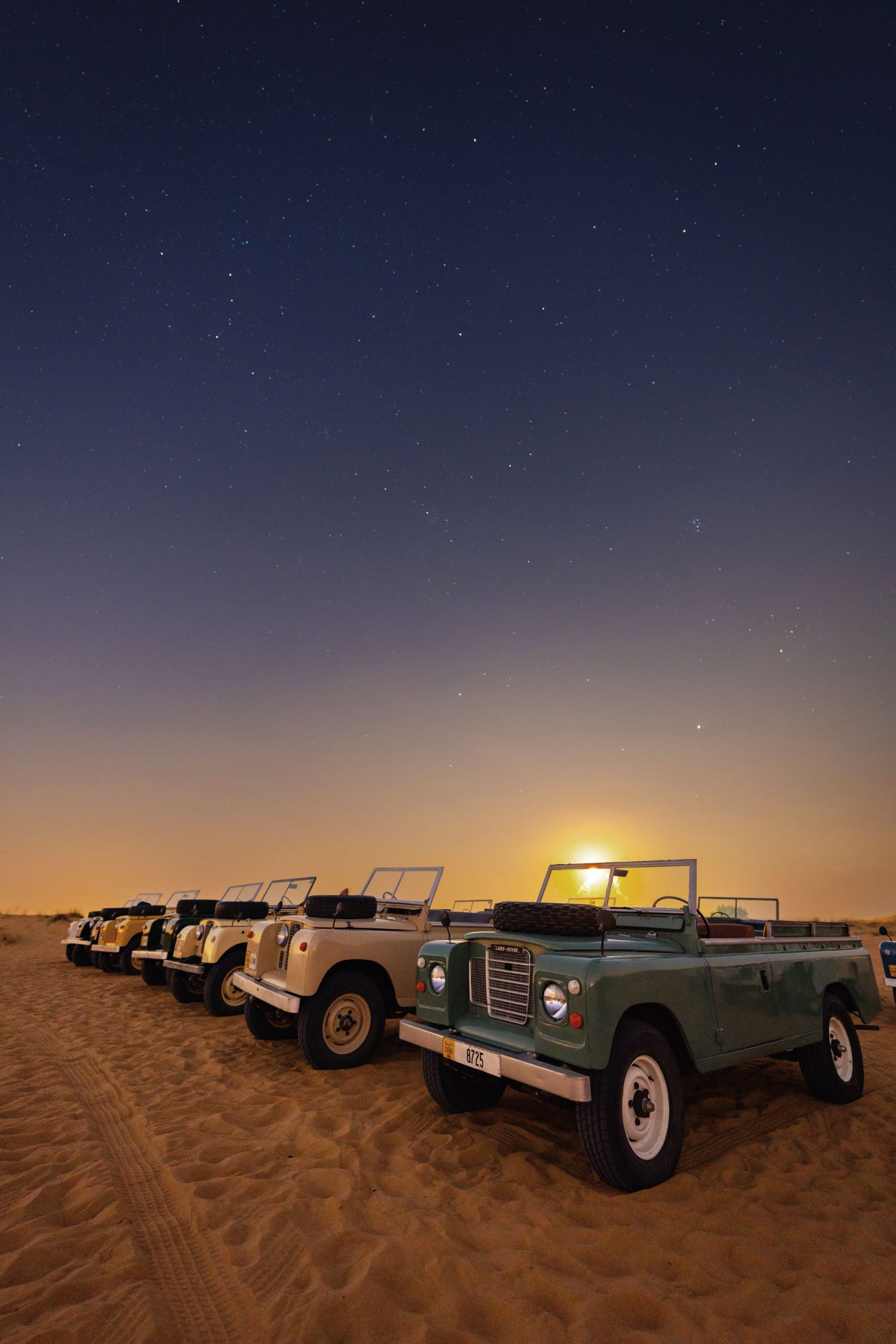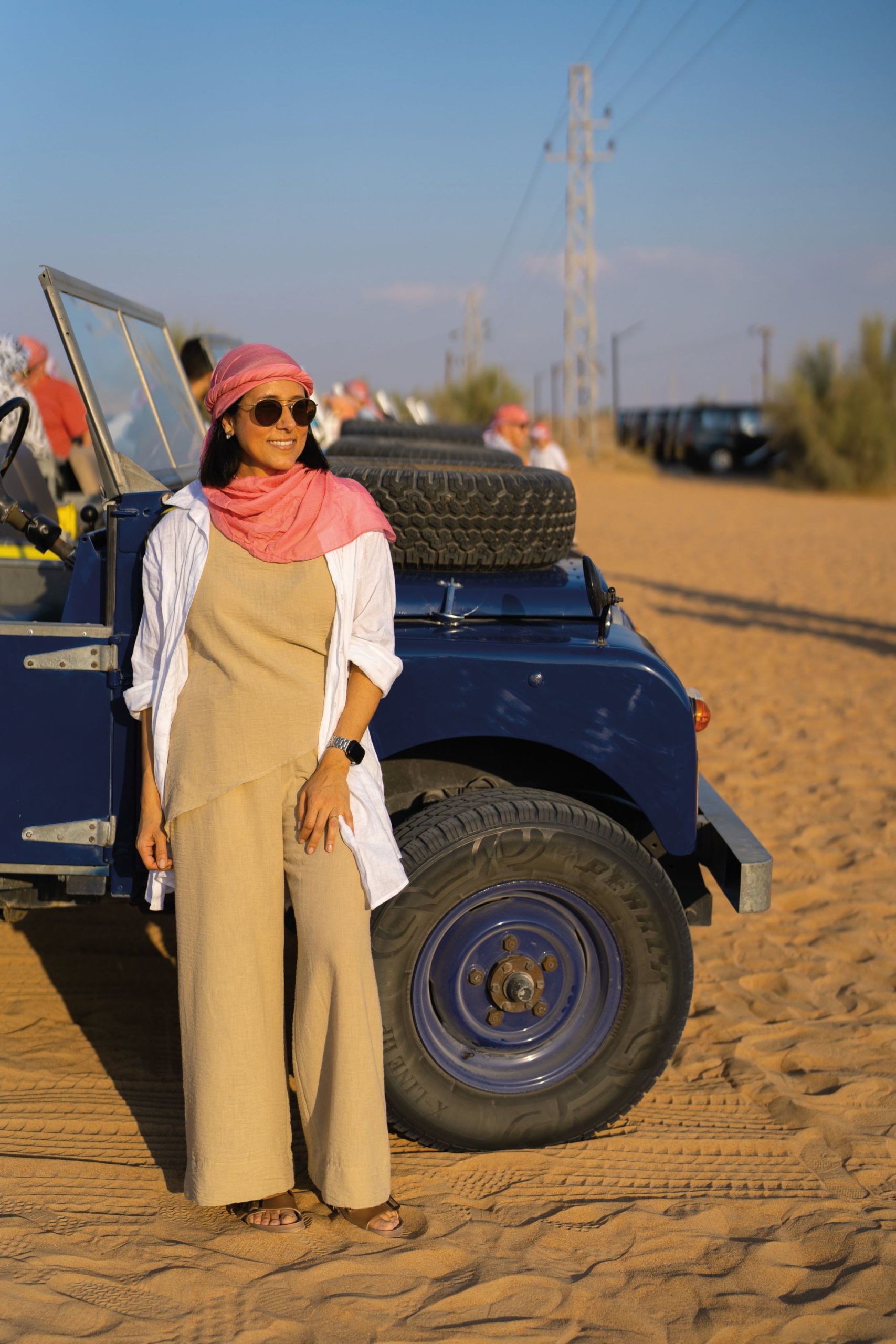 Nosso guia nos ajuda a amarrar o tradicional lenço beduíno: colorido para as mulheres e axadrezado em vermelho e branco para os homens. O keffiyeh protege cabeça e rosto do sol e da areia. Ali começava nossa aventura no deserto. Subimos em um charmoso Land Rover da década de 1950. Os carros vintage foram trazidos por militares ingleses e eram usados em expedições de exploração de petróleo. Enquanto o jipe corta o deserto, a luz do fim da tarde esquenta as cores da paisagem. Estamos diante de um espetáculo da natureza.