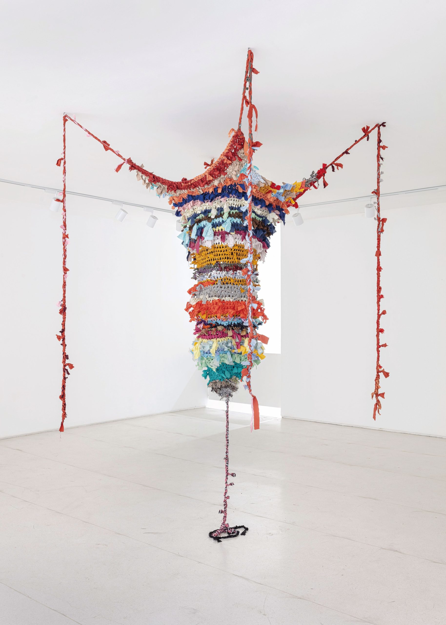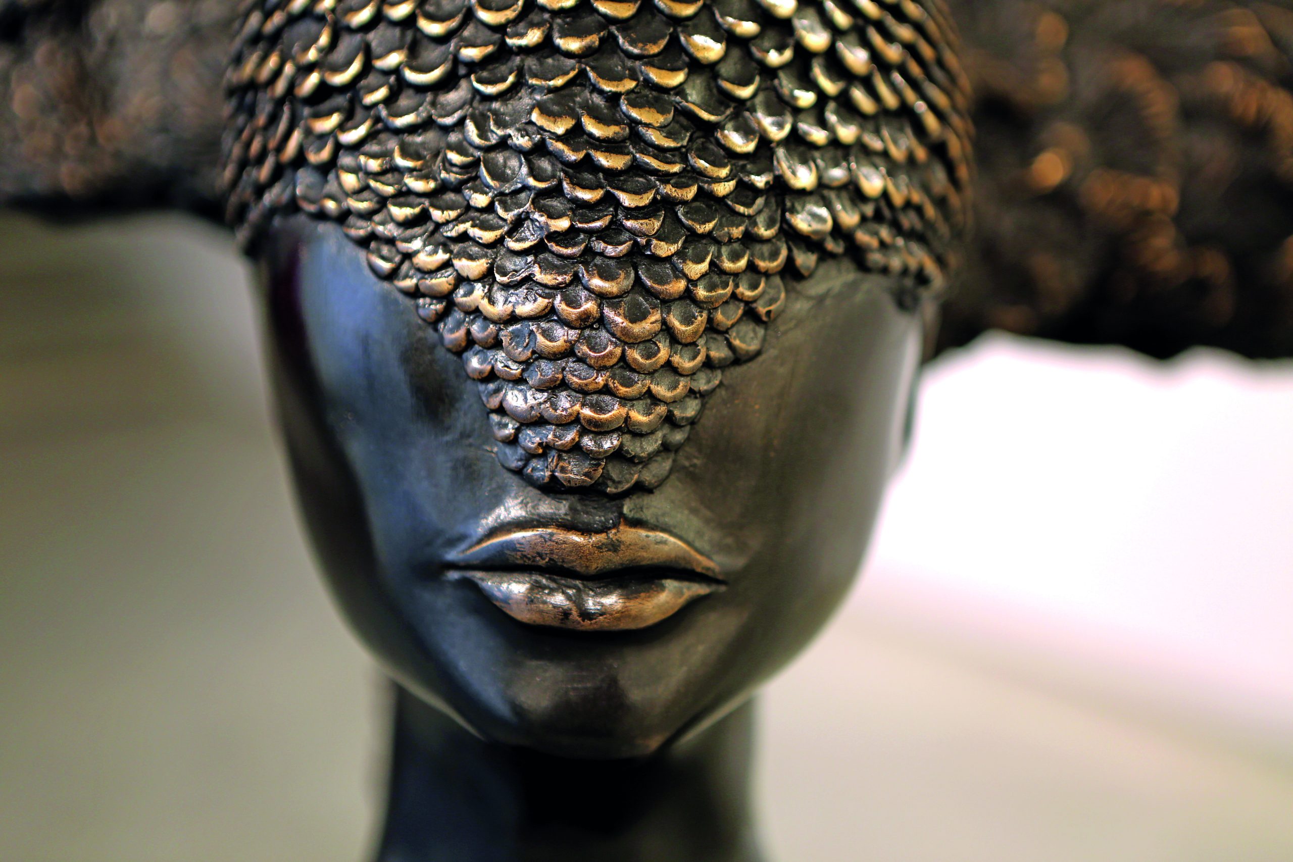 Nascida em Salvador, Bahia, Nádia cria esculturas com miçangas que remetem a balangandãs, as joias africanas que, além da função de enfeite, tinham um significado espiritual e eram usadas pelas mulheres negras escravizadas na época do Brasil Colônia.